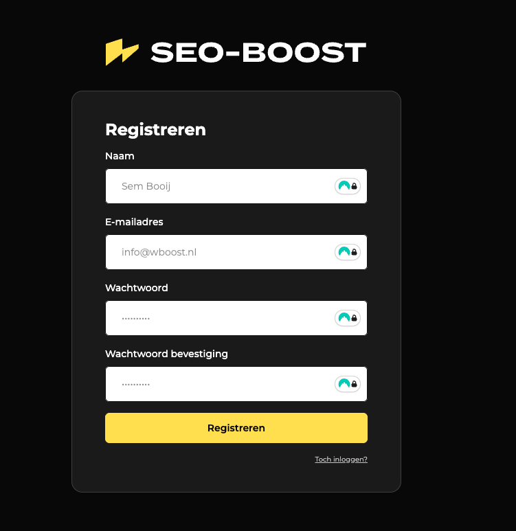 ⚠️ Belangrijk: Zorg ervoor dat je je e-mailadres en wachtwoord goed onthoudt. Mocht je ooit de toegang tot je account verliezen, dan kan alleen een medewerker van seo-boost.ai je helpen om dit te herstellen.