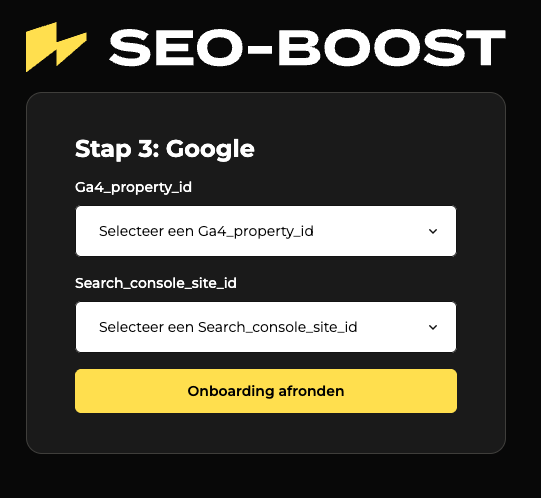 Dit zorgt ervoor dat seo-boost.ai inzicht krijgt in zoekwoorden, indexatie en prestaties in Google.